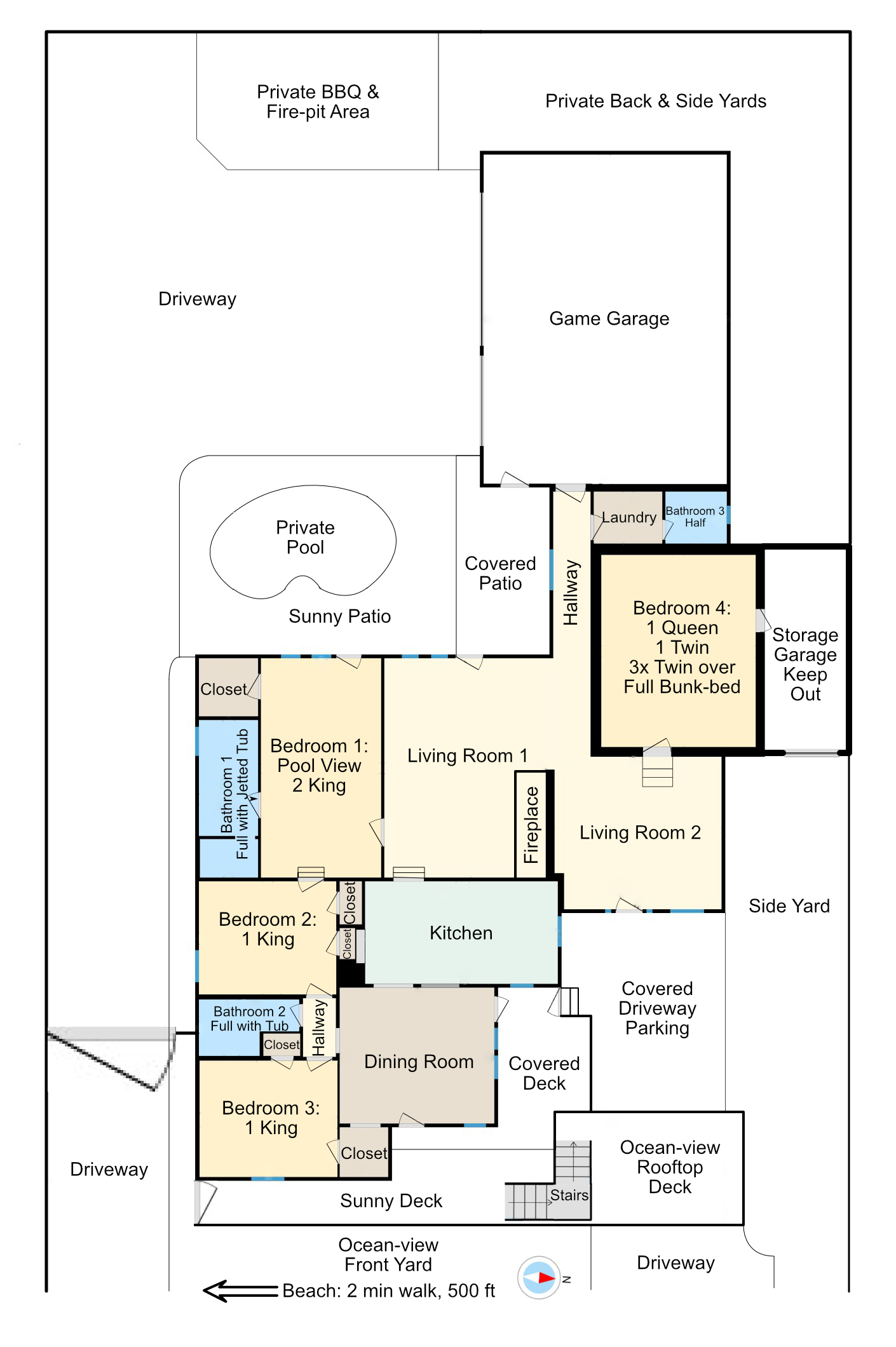Your family will be close to everything when you stay at this enormous 4000 sq ft centrally-located beach home that is a 2 min walk (500 ft) from the beach! Complete with private pool (heating available); a rooftop deck & patio with stunning ocean views; an enormous private yard; a game garage with billiards, ping pong, foosball, darts, & much more! This spacious home has 2 living rooms, 4 king beds, & plenty of space to stretch out! Complete with a virtual 360 tour that is sent upon booking!