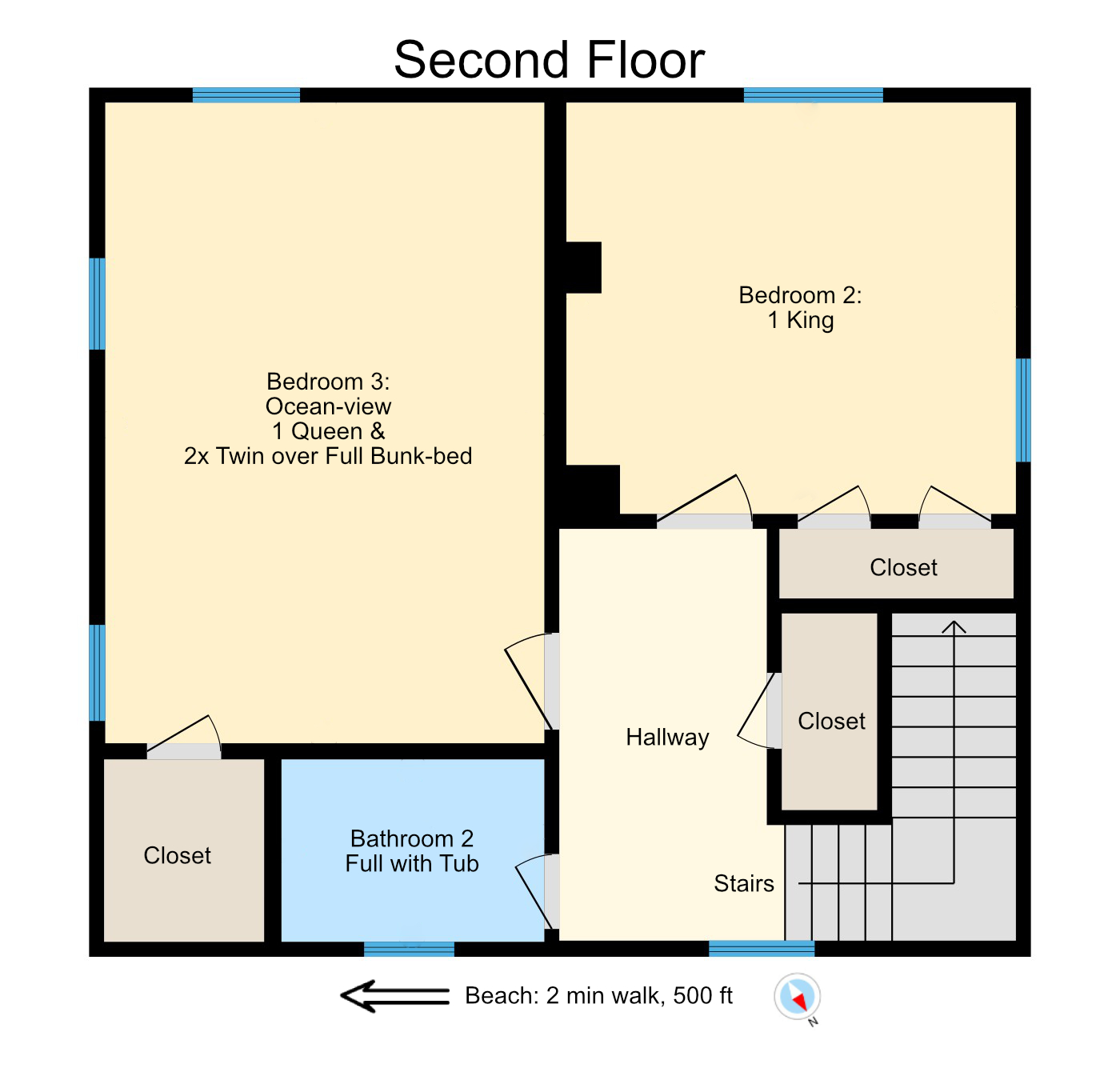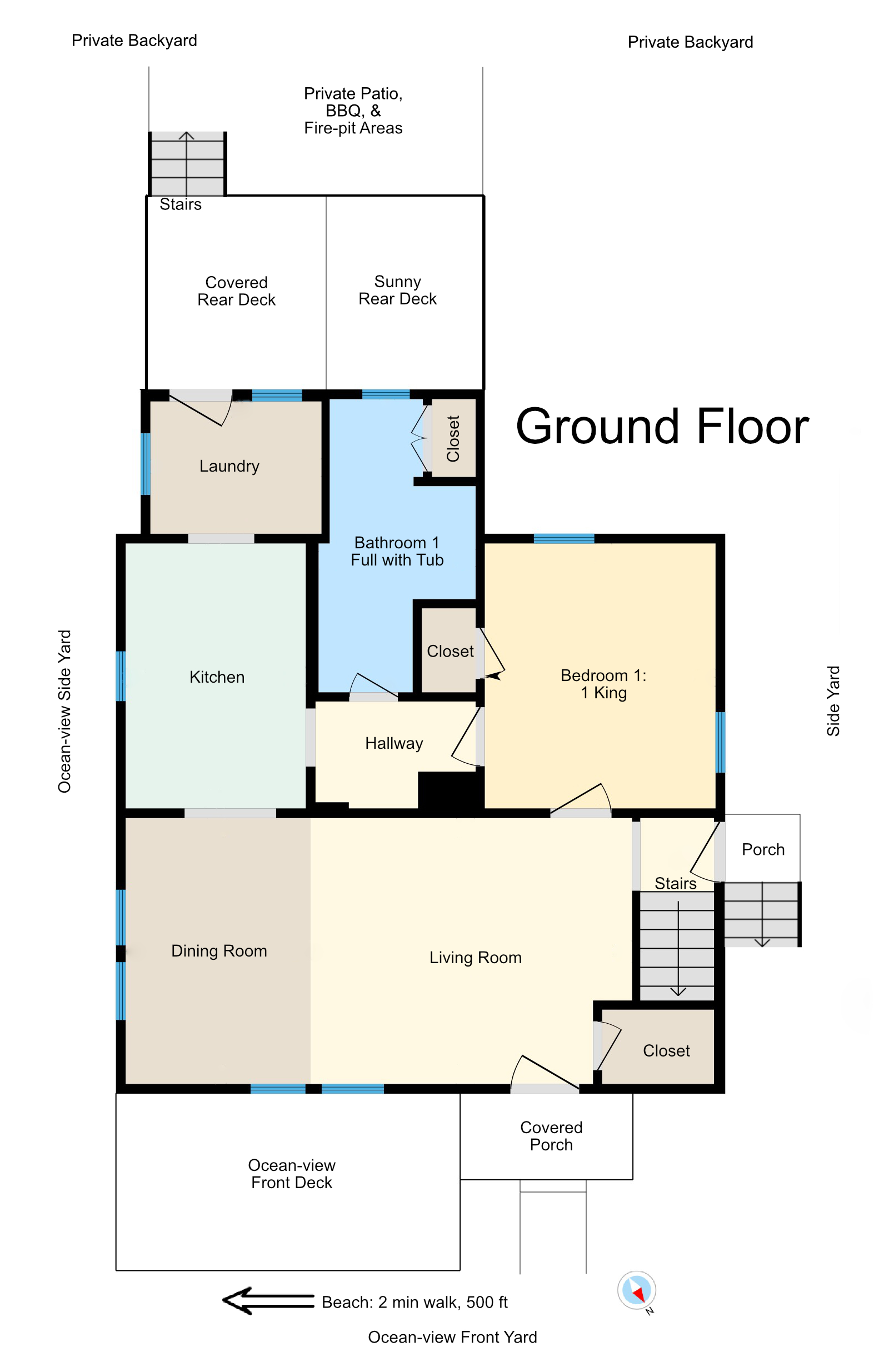 This spectacular property is as central as you can get for a single family private home that includes an enormous private yard, 2 huge decks/patios, firepit, BBQ, and ocean views! As such, this property is a rare find and books quick! This cozy home includes 2 king beds, smart TVs in all 3 bedrooms and living room and has plenty of space to stretch out or lounge in the sun! The yard comes complete with an enormous top of the line park-grade double sided charcoal BBQ grill that swivels, a fire pit, and outdoor yard games! Rest easy knowing that this amazing property is professionally and regularly maintained with a large variety of service contracts with professional companies that include same day and after hours emergency services for the unlikely event you experience any issues during your stay! -Air conditioning / HVAC: Air filters are replaced every 4 weeks. We also have a contract with professional company that includes: 1) regular cleaning and maintenance 2 times per year and 2) priority same-day and after hours emergency service for any unlikely issues! -Appliance repair: We have a professional company who provides same day and after hours emergency services for any unlikely issues! -Landscaping and gardening: We have a contract with a professional company who comes 1 or 2 times per month (varies by season)! -Pest control: We have a contract with a professional company who comes once every 2 months and provides same day service for any unlikely issues! -Others: We utilize and contract with a professional cleaning company, a professional linen company, professional handymen, and professional plumbers who are all on call to handle any needs that may arise including same day and after hours emergency services for any unlikely issues! Another added bonus is that this property comes complete with a 360 virtual tour that is available upon booking! This tour helps you visualize the property spaces! We are confident that this virtual tour alongside the floor plan photos within our listing will help you prepare for your trip by providing transparency to the property layout and helping you with organizing sleeping arrangements within your group! Please note that we often upgrade/change out furniture and property items so the property might look slightly different than the photos! In other words, the information and pictures within this listing are deemed accurate but are not guaranteed: they are subject to errors, omissions, or withdrawal without notice. Bed sizes and locations will remain the same though! Please see floor plans included within the photos as well!
