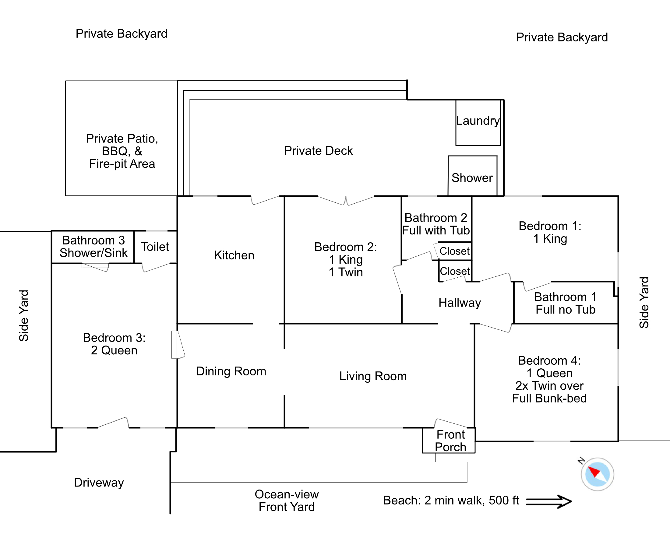 Your family will be close to everything when you stay at this centrally-located beach house that includes an enormous private fenced-in yard, deck, patio, outdoor firepit, BBQ, 2 king beds of 10 total beds, ocean view from the yard, & much more! This amazing home includes a smart TV within all 4 bedrooms, the living room, and dining room! The property is a short walk to many attractions such as the beach, restaurants/bars, & shopping! Complete with a virtual 360 tour that is sent upon booking!